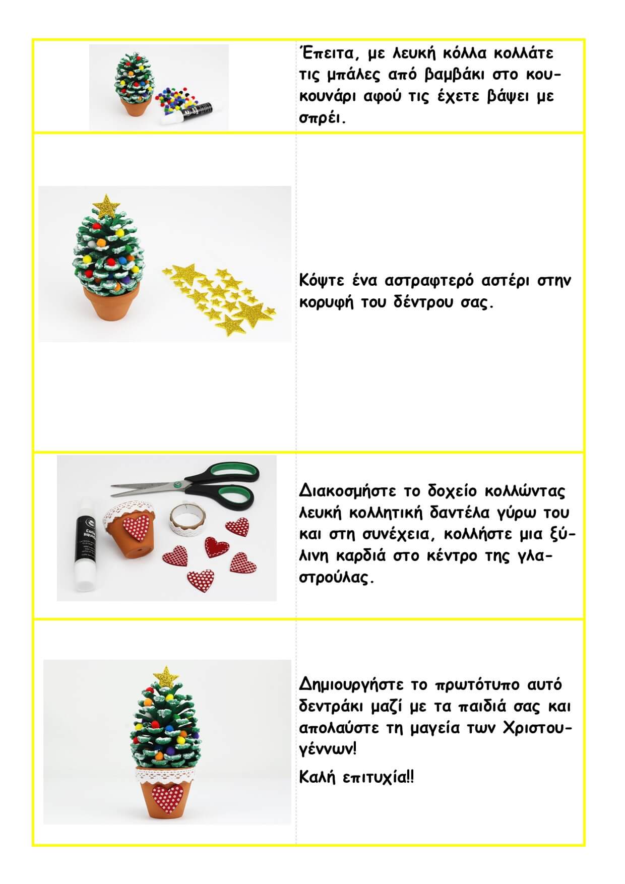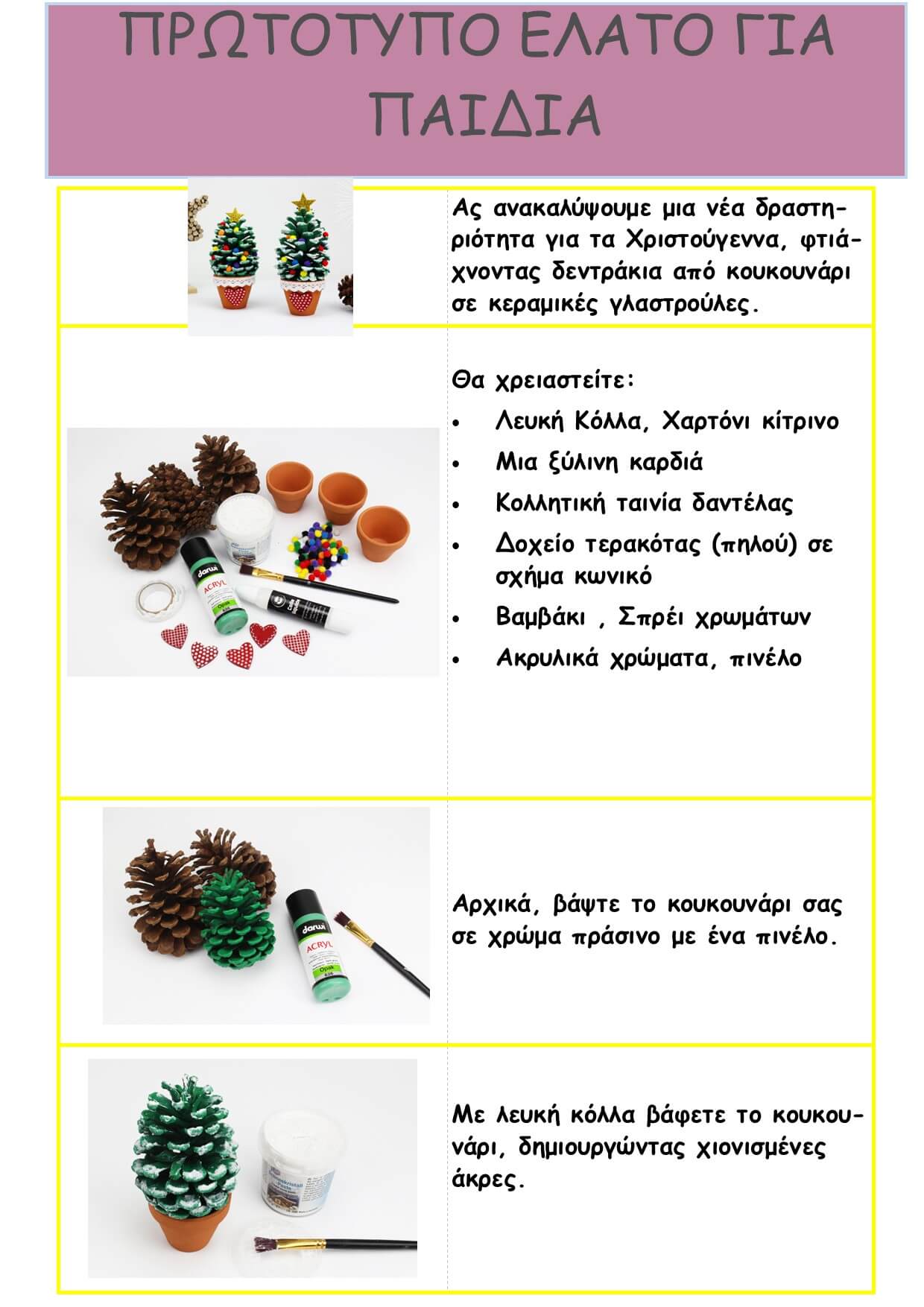Ας ανακαλύψουμε μια νέα δραστηριότητα, φτιάχνοντας ελατάκι από κουκουνάρι μέσα σε κεραμική γλαστρούλα. Η διεπιστημονική ομάδα του Εύλογον, σας δείχνει λοιπόν πως θα φτιάξετε και σεις ένα απίθανο δεντράκι Χριστουγέννων από κουκουνάρι, χρώματα και μπόλικη φαντασία! Τα παιδιά έχουν τη δυνατότητα να εξασκηθούν στη χρήση του ψαλιδιού και παράλληλα να έρθουν σε επαφή με διάφορα υλικά που εμείς γνωρίζουμε καλύτερα ως ενήλικες, κατά τη διάρκεια της κατασκευής τους. Συνδυασμός γνώσης και χαράς είναι τα απαραίτητα στοιχεία για ολοκληρωμένα και ευτυχισμένα παιδιά. Η ίδια δραστηριότητα μπορεί να υλοποιηθεί με παιδιά 3 ετών και άνω, εφόσον κάποιος ενήλικας βοηθήσει στο κόψιμο με το ψαλίδι. Σε μεγαλύτερα παιδιά από 4,5 ετών μπορεί ο ενήλικας να επιβραβεύει την προσπάθεια και να προτείνει στο παιδί να την ολοκληρώσει με διαλείμματα αν χρειαστεί. Σύμφωνα με τους ειδικούς μας παιδαγωγούς, είναι εξαιρετική δραστηριότητα για την εκπαίδευση στην ολοκλήρωση δραστηριοτήτων και βελτίωση της συγκέντρωσης. Οι εργοθεραπευτές μας, σας το προτείνουν για τη χρήση ψαλιδιού και τον οπτικοκινητικό συντονισμό. Όπως σε κάθε δραστηριότητά μας, εφόσον την προσφέρουν σε κάποιον οικείο τους, θα σας δοθεί η ευκαιρία σε δεύτερο χρόνο να τους επισημάνετε τις αντιδράσεις του αποδέκτη και τα συναισθήματα που του δημιούργησε η συγκεκριμένη χειρονομία. Εξαιρετική ευκαιρία σύμφωνα με τις ψυχολόγους της ομάδας μας, να εξασκήσετε τη συναισθηματική νοημοσύνη τους. Μη ξεχάσετε, όπως κάθε φορά, στο τέλος της δραστηριότητας, να τους επιβραβεύσετε για την προσπάθειά τους.