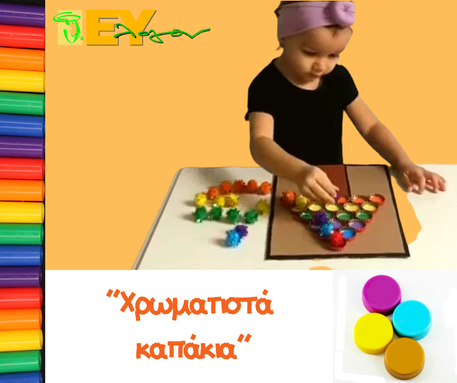 Οδηγίες εκτέλεσης: Επάνω στο χαρτόνι σχεδιάζουμε ένα τρίγωνο από καπάκια, βάζοντας τα ανάποδα. Το τοποθετούμε μπροστά από το παιδί και δίπλα του βρίσκονται τα χνουδωτά μπαλάκια. Ζητάμε από το παιδί, ανάλογα με το χρώμα που του λέμε να τοποθετήσει το μπαλάκι στο αντίστοιχο καπάκι(πχ πάρε το πράσινο μπαλάκι και βάλε το στο πράσινο καπάκι). Δίνουμε όσο χρόνο χρειάζεται. Σε περίπτωση που δεν το καταφέρει ή το τοποθετήσει λάθος, του υποδεικνύουμε το σωστό, το βάζουμε στην αρχική του θέση και το ενθαρρύνουμε να συνεχίσει.
