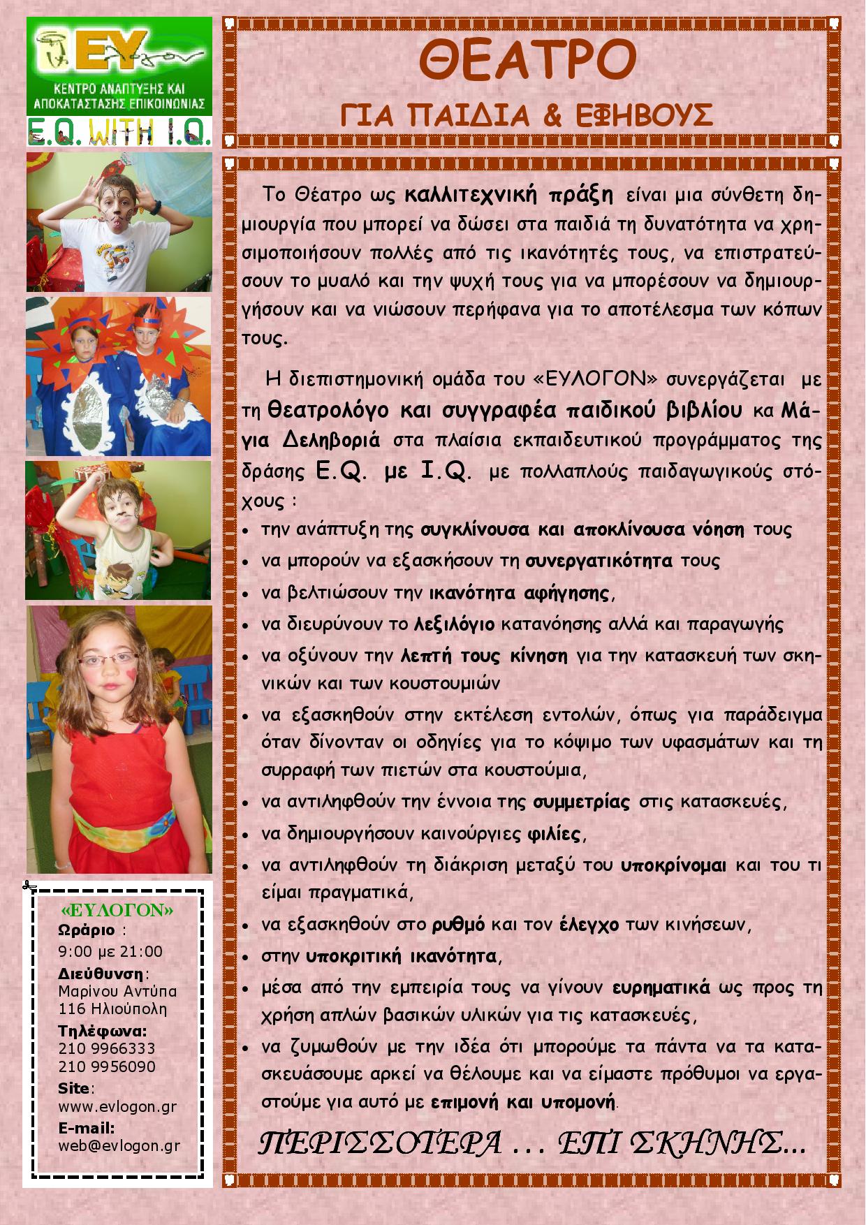 01.10.2011 - Δημιουργική δραστηριότητα για τον ελεύθερο χρόνο: ΘΕΑΤΡΟ ΓΙΑ ΕΦΗΒΟΥΣ ΚΑΙ ΠΑΙΔΙΑ